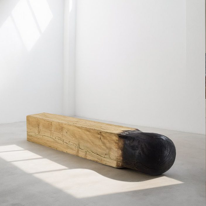 Bench made from a single block of fragrant solid cedar wood. Its design is inspired by the shape of a matchstick, highlighted by the “volcano” finish applied to one end of the bench, which is rounded and slightly enlarged to evoke the match head.